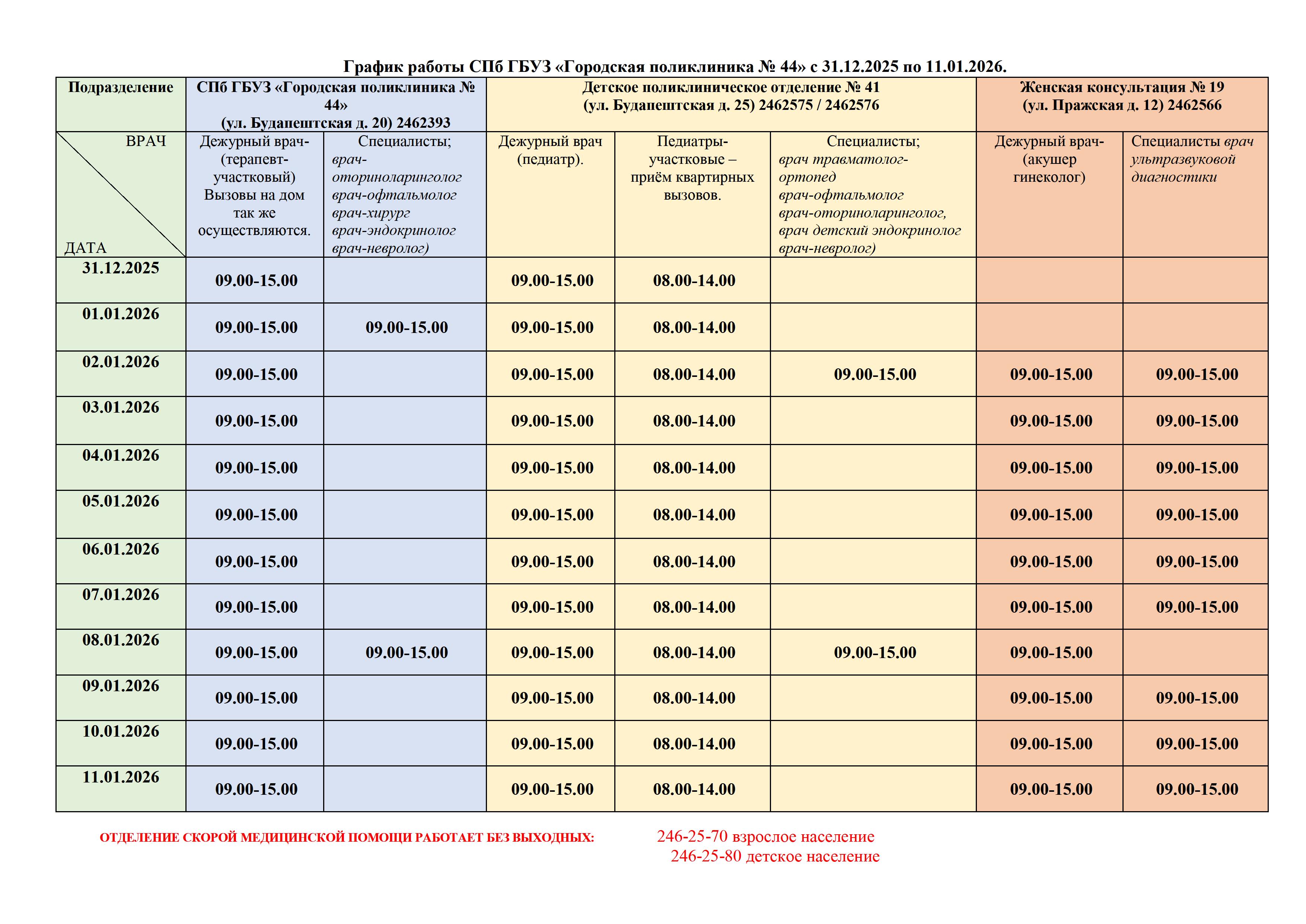 Уважаемые пациенты! Публикуем для ознакомления график работы поликлинических отделений Городской поликлиники №44 в выходные и праздничные дни на период с 31.12.25 по 11.01.26.